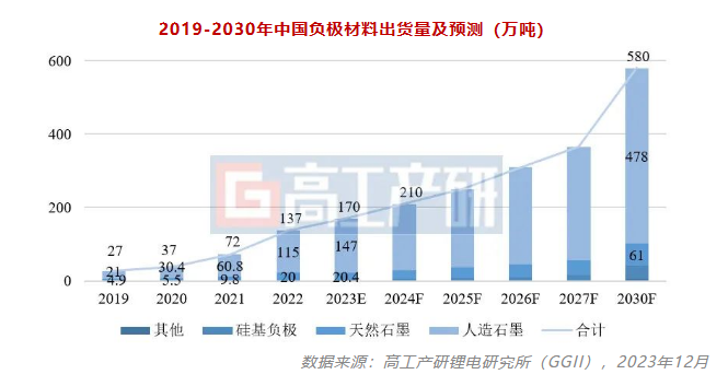 首先,从市场空间来看,面向TWh时代,负极材料市场仍具持续增长潜力。GGII预计,2030年我国负极材料出货量有望达到580万吨,其中人造石墨仍为市场主流,出货量超470万吨。
